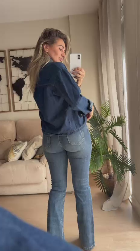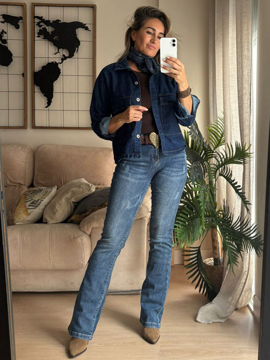 Chaqueta vaquera en denim azul oscuro, con corte recto y detalles minimalistas que la convierten en un fondo de armario imprescindible.