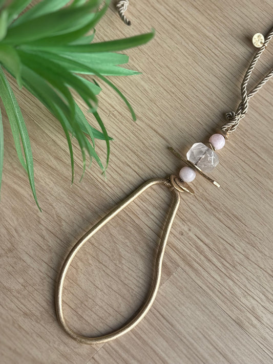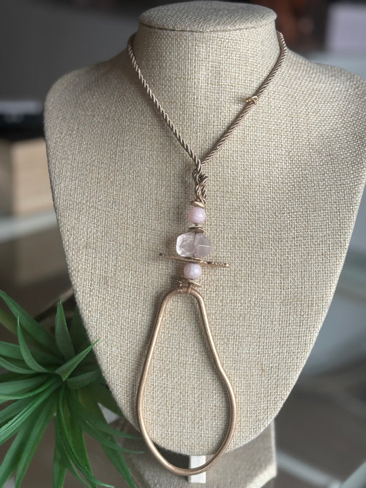 Collar largo de inspiración bohemia, compuesto por cuentas grandes en tono rosado, que aportan calidez y personalidad al look. Presenta un diseño llamativo con un colgante central geométrico, formado por piezas metálicas y detalles en piedra natural, creando un contraste sofisticado y original.