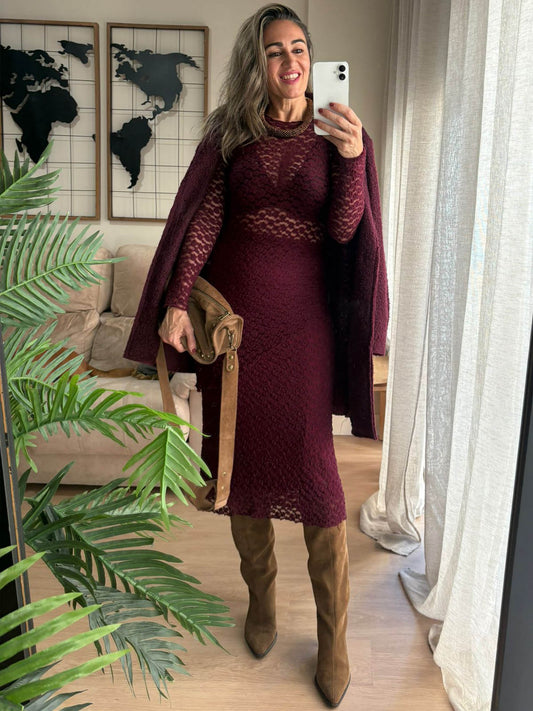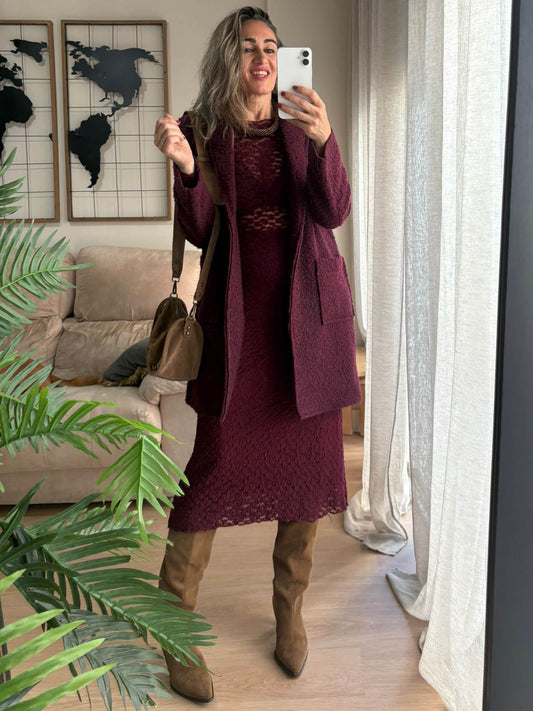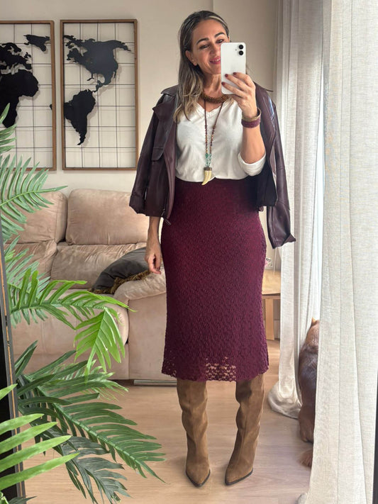 La falda Cacao Granate destaca por su tejido de punto calado con relieve, que aporta un efecto visual precioso y una caída ligera que se adapta con suavidad al cuerpo. Su corte midi recto estiliza la figura sin marcar, creando un equilibrio perfecto entre elegancia y comodidad.
