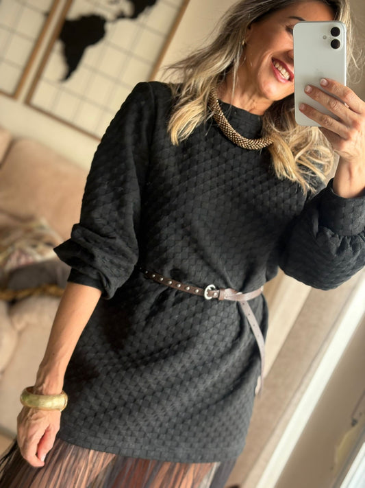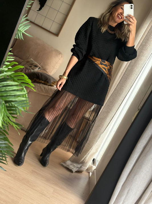 Lo cómodo de una sudadera, lo especial del tul. Parte superior en tejido tipo sudadera con relieve panal, manga larga y escote redondo; remata en una falda de tul plisado y fluido que deja entrever las piernas con un efecto ligero y muy chic.