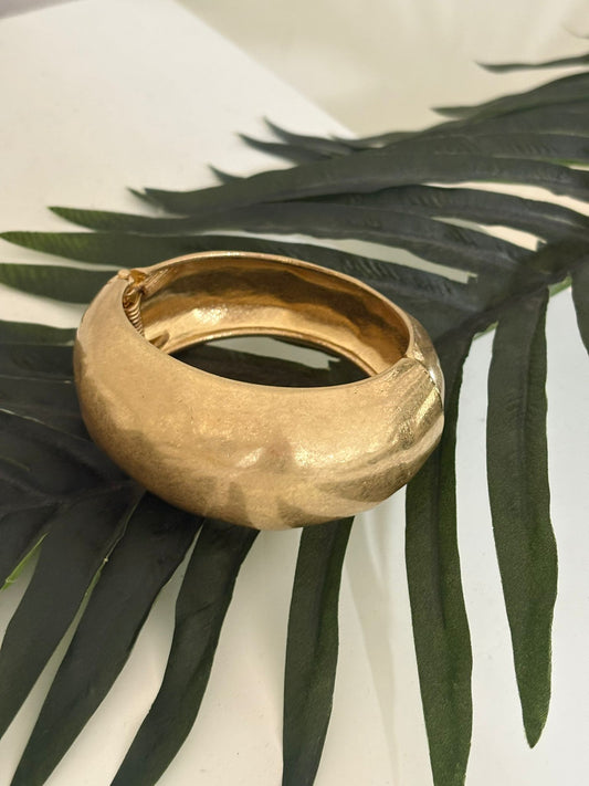 El Brazalete Gold es ese complemento infalible que eleva cualquier look. De diseño ancho y forma abombada, su acabado dorado mate con textura martillada añade un toque artesanal, elegante y lleno de carácter.