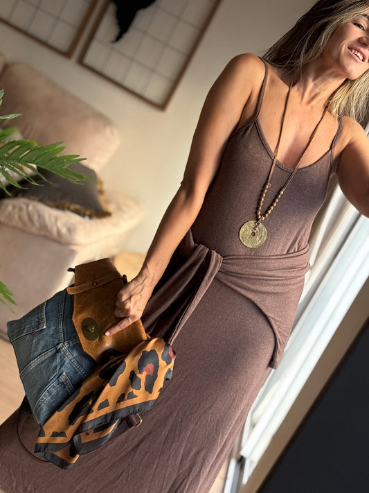 Este vestido de punto dos piezas es una apuesta segura para tus días más versátiles. Su diseño incluye un vestido de tirantes fluido y un top a juego, que puedes llevar juntos o por separado según la ocasión.
