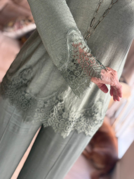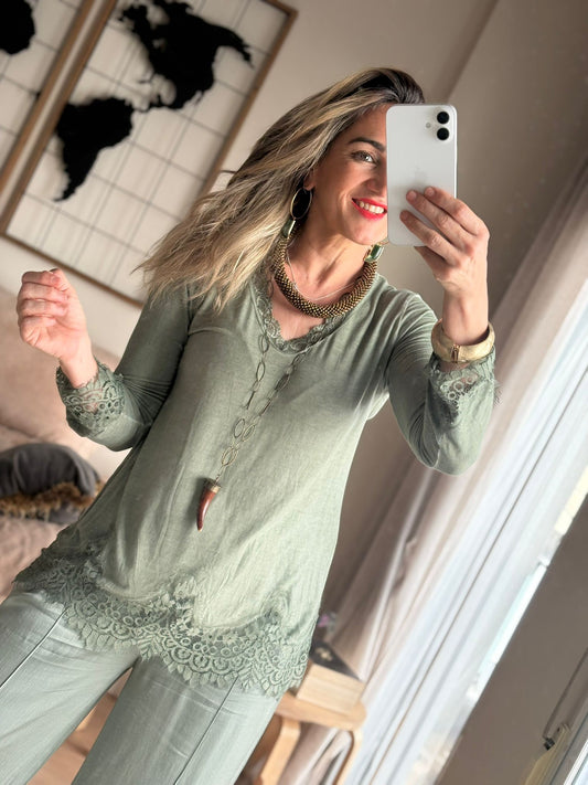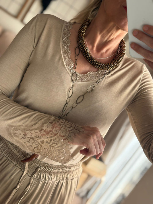 Cuello redondeado con detalle de encaje y acabado también en mangas y bajo, que aporta un toque femenino y especial sin recargar. Perfecta para llevar sola o debajo de chaquetas y cárdigans.