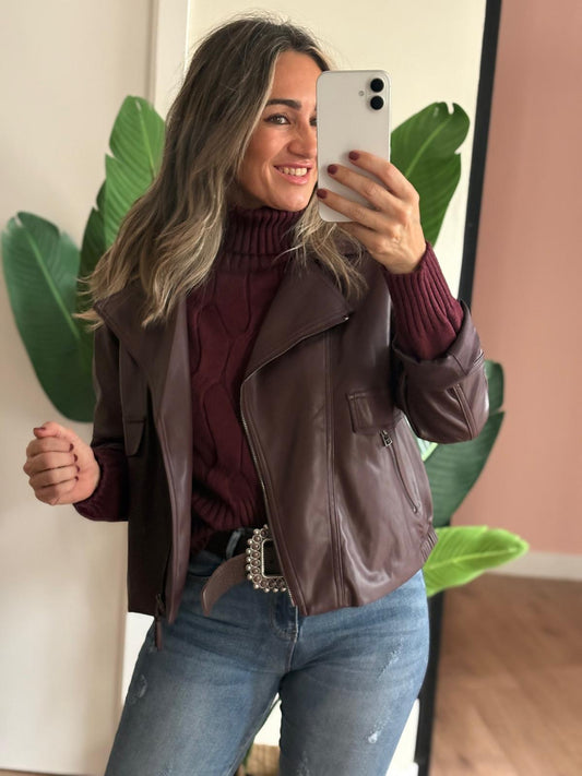 La cazadora Burdeos combina estilo y versatilidad con un diseño tipo biker suave y elegante. Su tejido efecto piel tiene una textura flexible y agradable, con un acabado mate que le da un toque sofisticado sin perder comodidad.