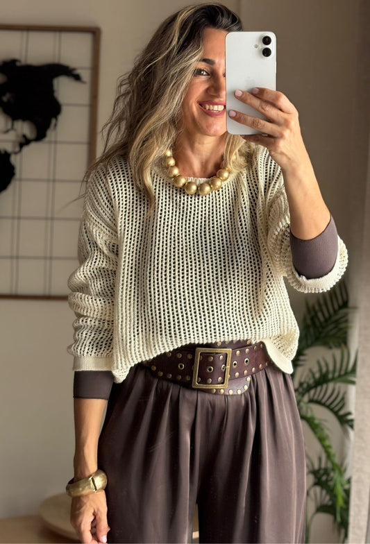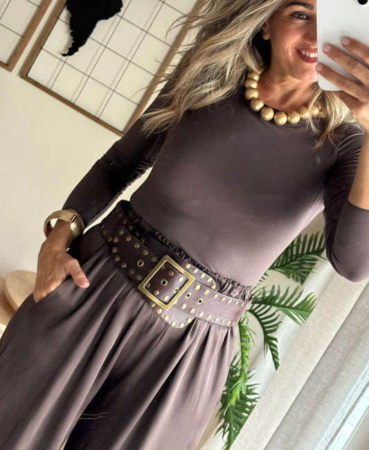 Cinturón ancho de piel en color marrón chocolate, con detalles de tachuelas metálicas envejecidas que le dan un aire bohemio y sofisticado. La hebilla cuadrada de gran tamaño refuerza su estilo potente y versátil, ideal para marcar la cintura sobre vestidos, monos o pantalones de tiro alto.