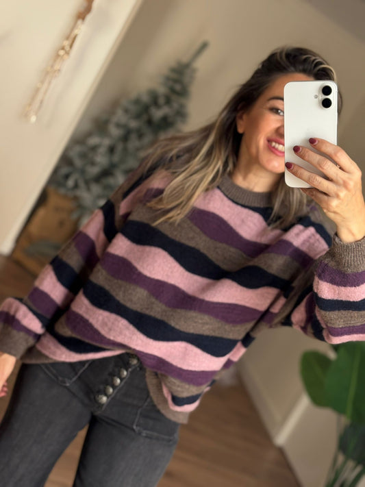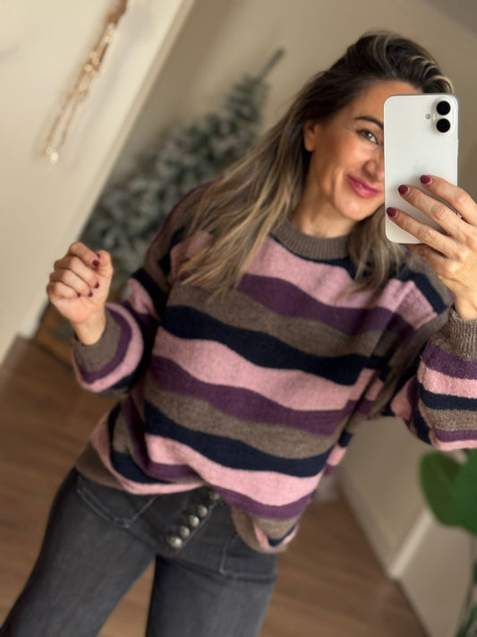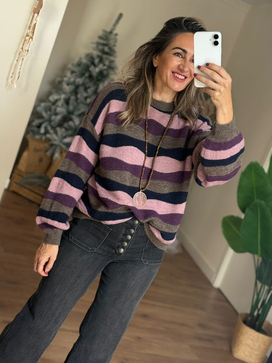 Un jersey cómodo, calentito y con un diseño que enamora. Sus rayas onduladas en tonos malva, topo, berenjena y azul marino crean un contraste precioso y muy favorecedor para el rostro. El tejido es suave, gustoso y con ese punto esponjoso que lo hace ideal para el día a día.