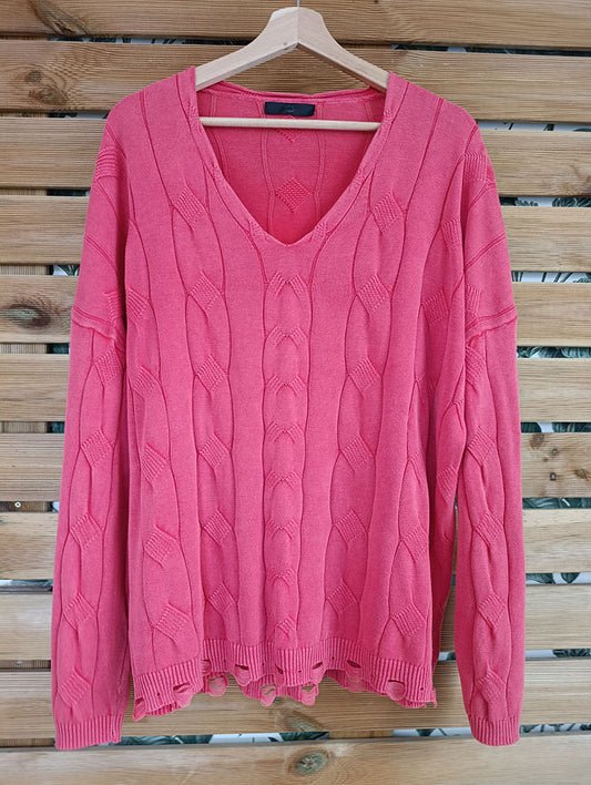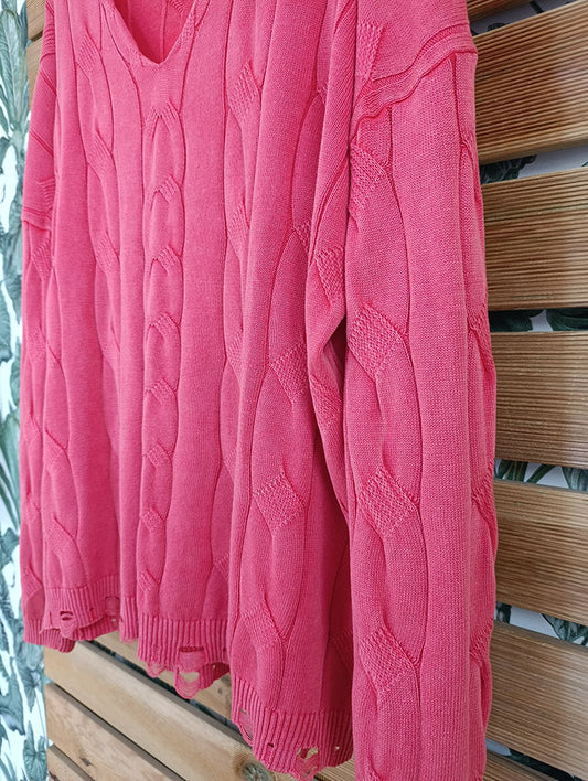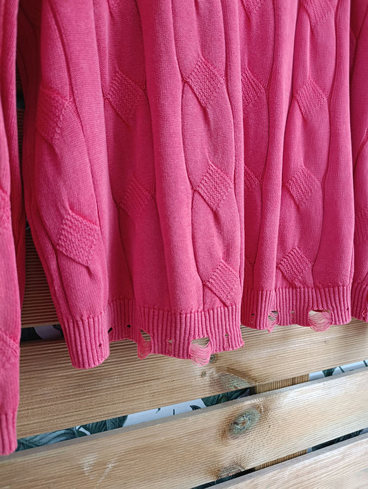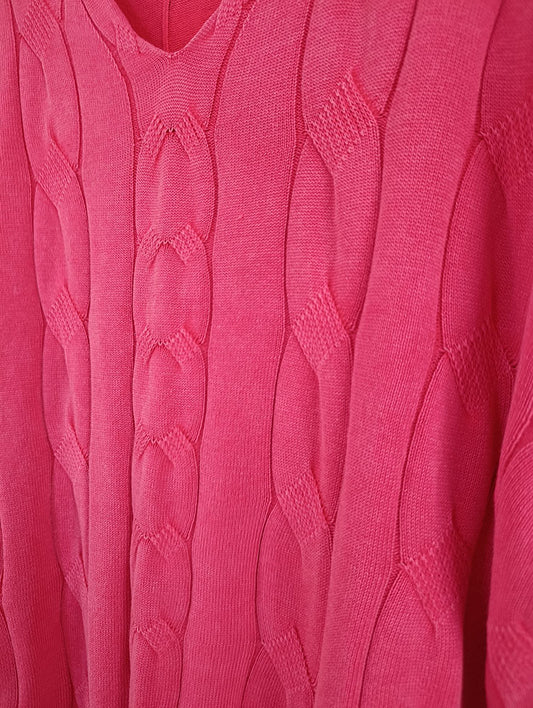 Sumérgete en el confort y la elegancia con este jersey de punto trenzado en rojo vibrante. Confeccionado en algodón de alta calidad, ofrece una textura rica y voluminosa gracias a su patrón cable knit (trenzas y rombos entrelazados) que aporta profundidad y un toque sofisticado sin esfuerzo.