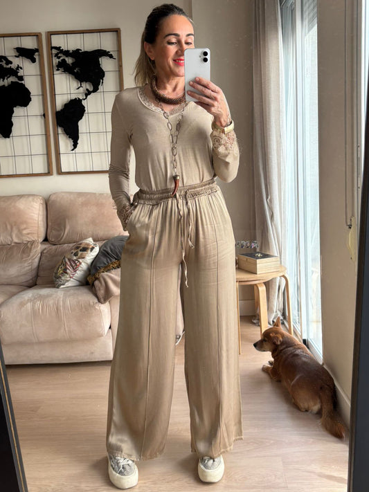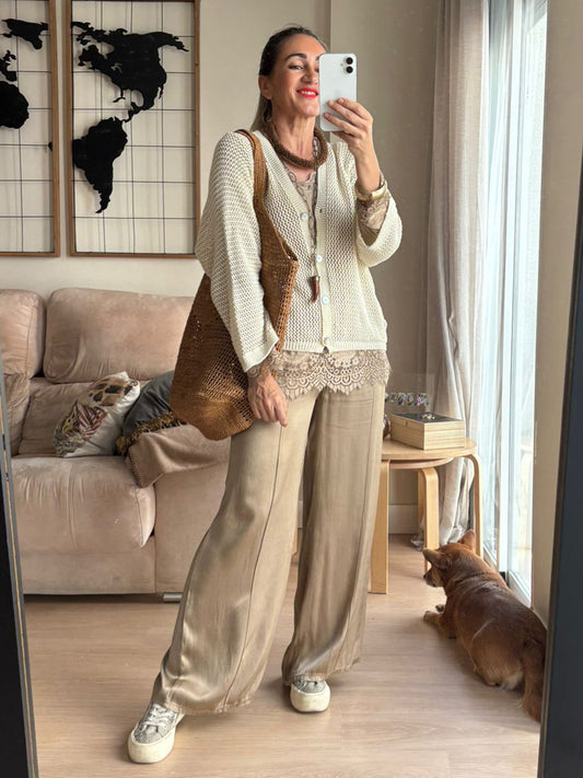 Nuestro pantalón más versátil y estiloso. De corte amplio y tejido satinado con una caída preciosa, este modelo combina comodidad y elegancia a partes iguales. La cinturilla elástica se adapta a tu figura sin apretar y los bolsillos laterales aportan ese toque práctico que tanto nos gusta.