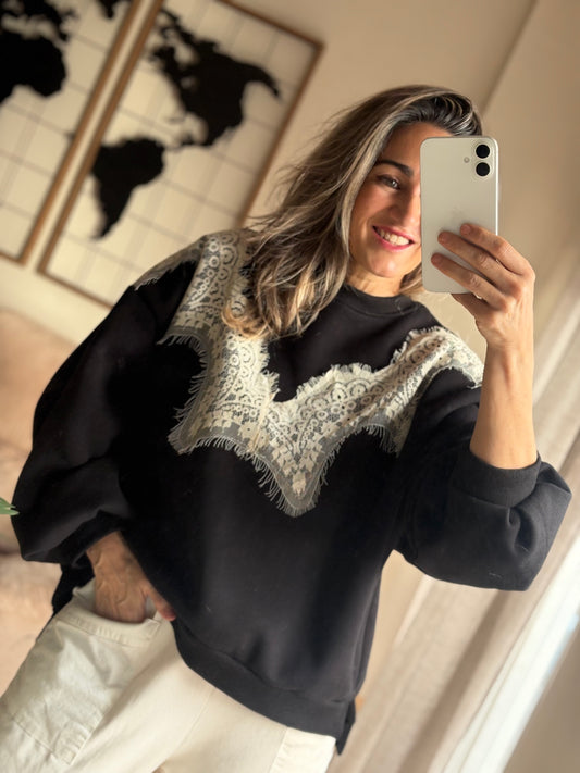 Una sudadera diferente, especial y llena de encanto. Su base negra aporta ese aire moderno y estiloso, mientras que la blonda en tono claro, con detalle deshilachado, dibuja una forma preciosa que ilumina el rostro y transforma una prenda casual en una pieza única.