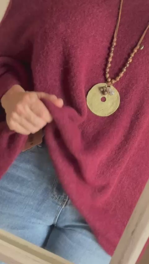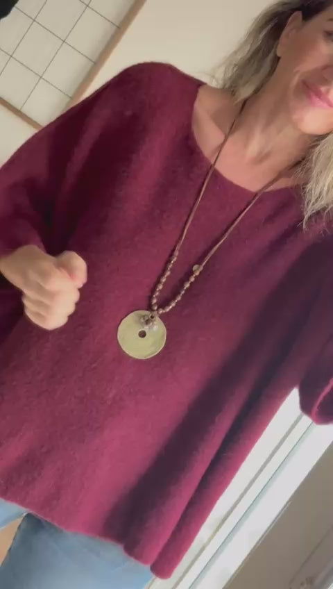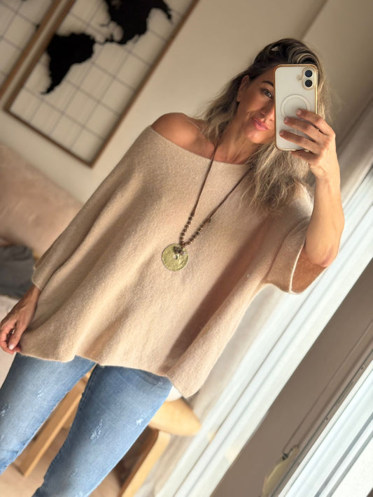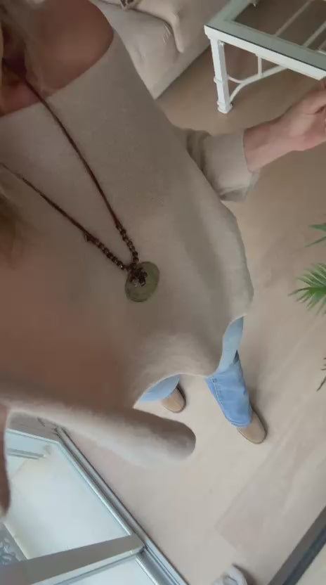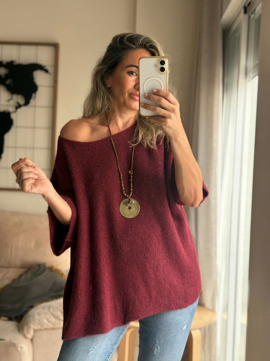 Nuestro suéter está confeccionado en un punto ligero, cálido y con tacto suave, ideal para los días frescos. Su diseño oversize y escote amplio permiten llevarlo de forma relajada, incluso dejando un hombro al descubierto para un toque femenino y chic.