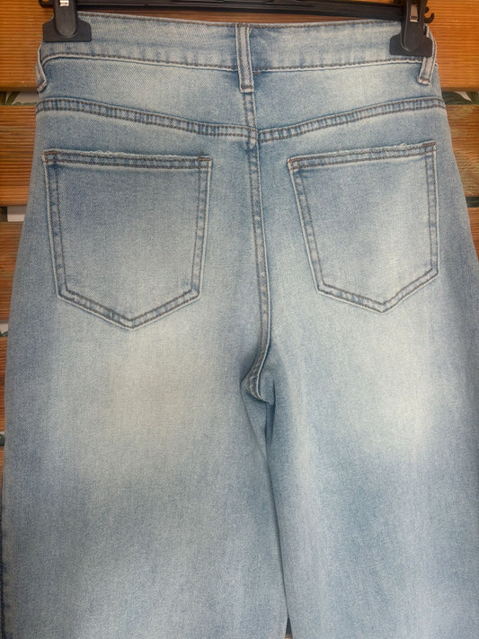 Pantalón vaquero de tiro alto que estiliza la silueta y favorece mucho la figura, pierna muy amplia con un efecto fluido y relajado. Lleva 5 bolsillos, dos delanteros, dos traseros y uno pequeño. Cierre con cremallera y botón metálico.